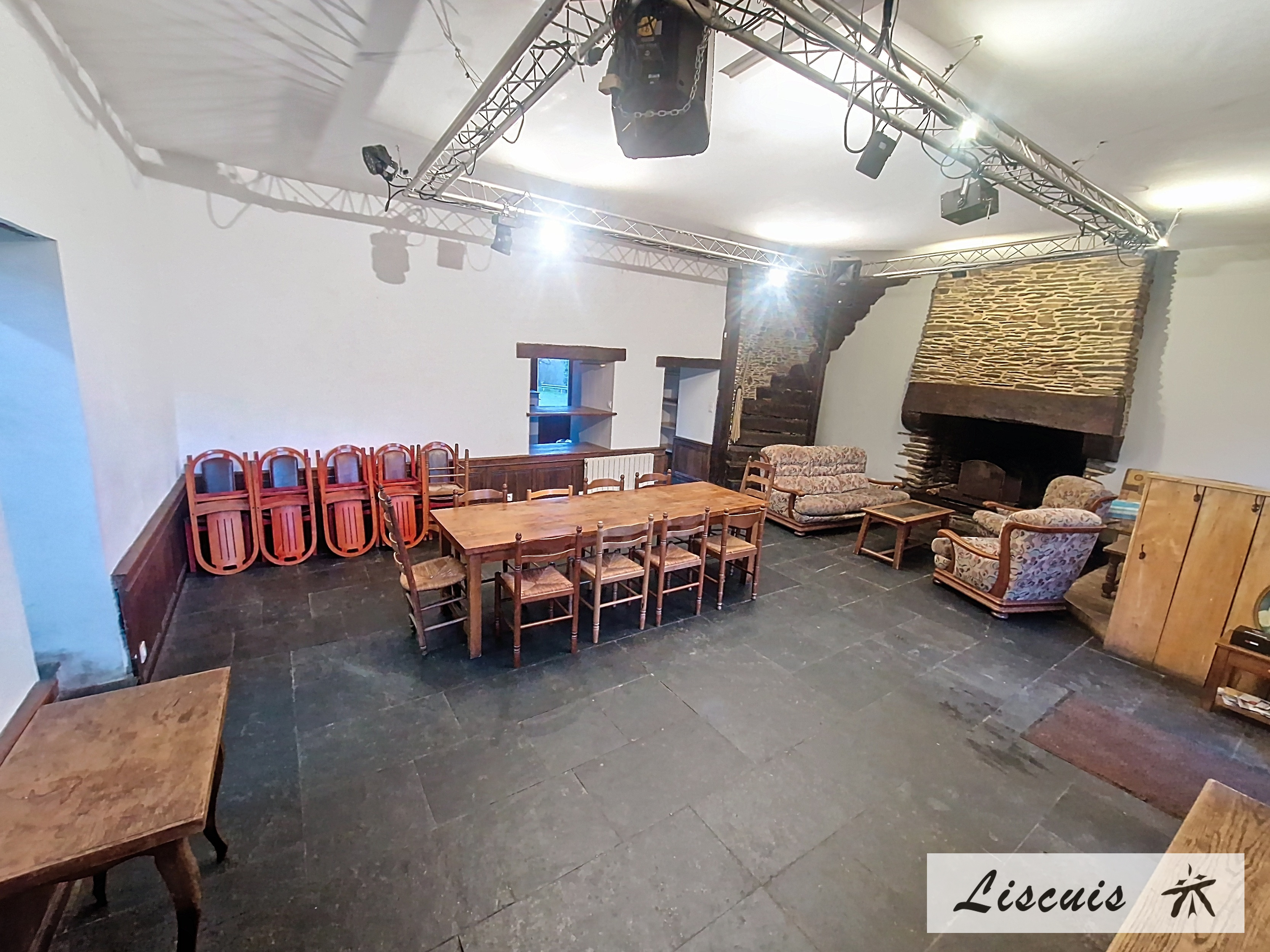Grande Cheminée avec coin salon, grande table et chaises