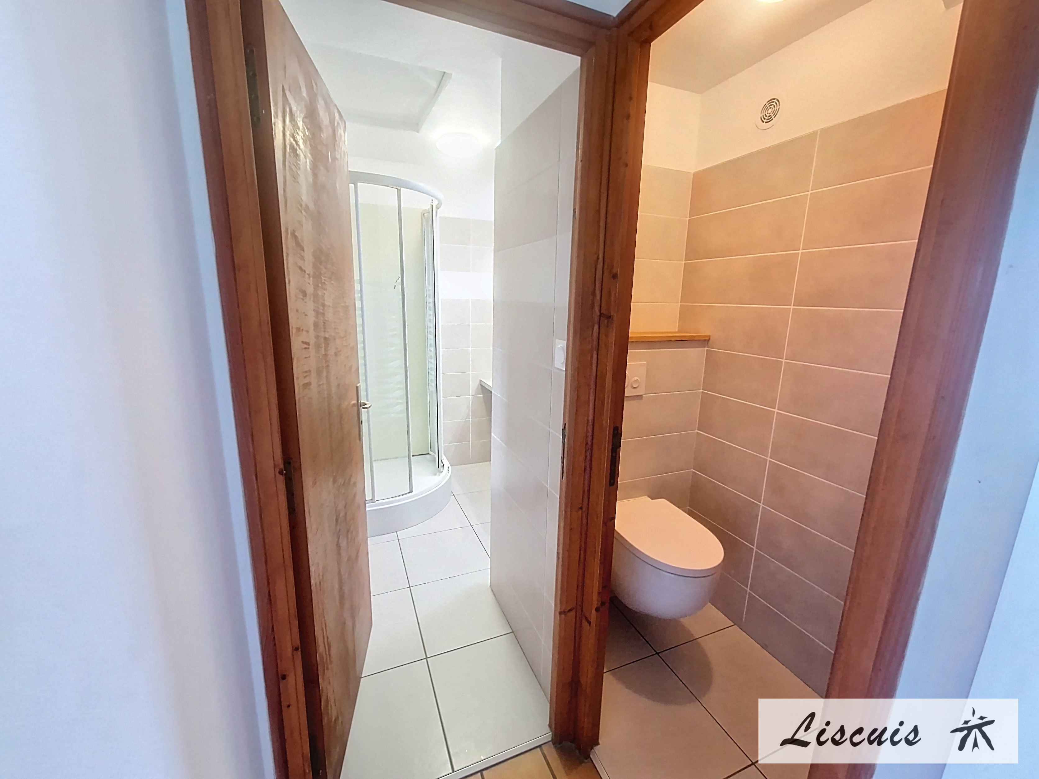 Salle de séjour rustique avec insert, coin cuisine et coin salon, salle de bain, wc